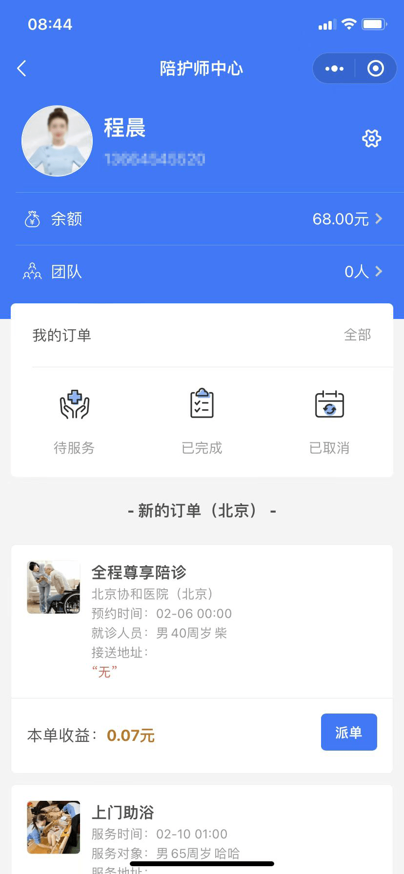 陪護(hù)師可在手機(jī)小程序端注冊(cè),并且手機(jī)端包含接單、處理訂單、提現(xiàn)、個(gè)人資料等完整功能方便隨時(shí)隨地操作