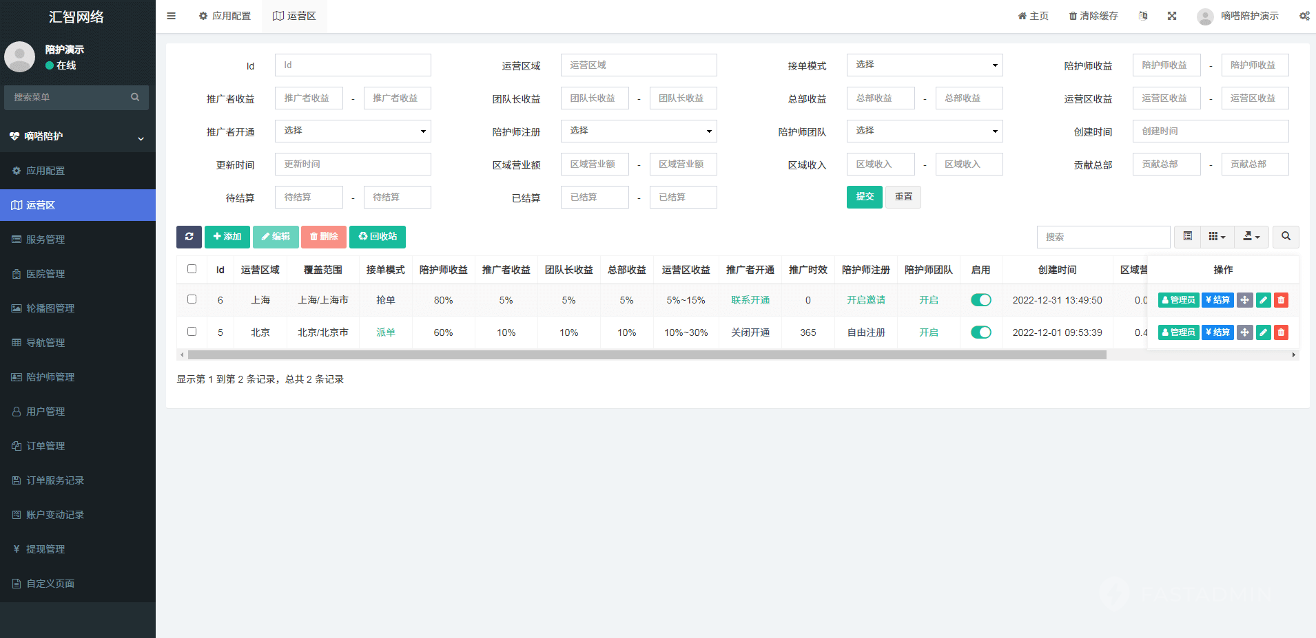支持創(chuàng)建多個(gè)運(yùn)營區(qū)交給代理或合作伙伴運(yùn)營,各運(yùn)營區(qū)可自定義范圍、首頁、價(jià)格、分成比例、接單模式等