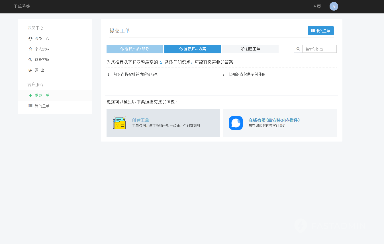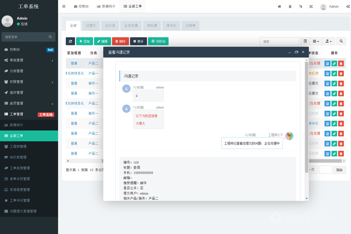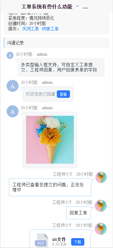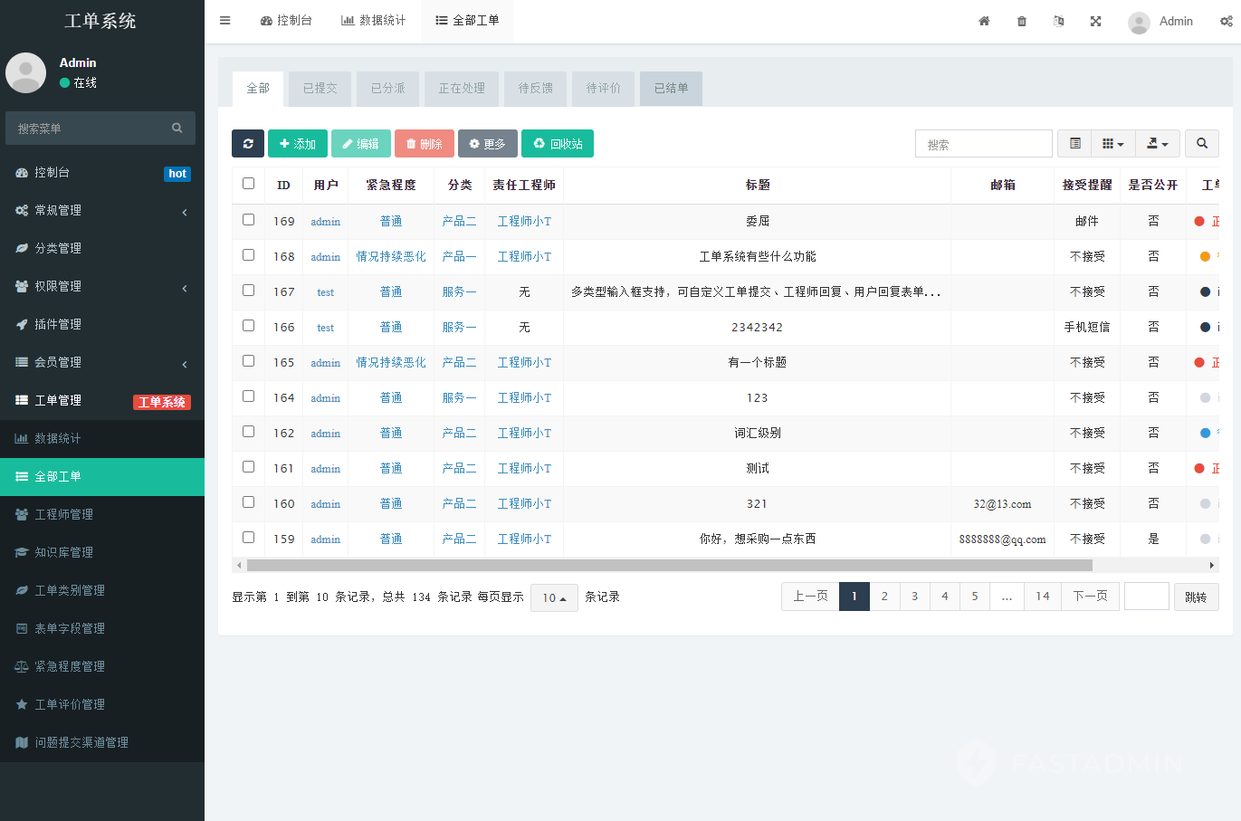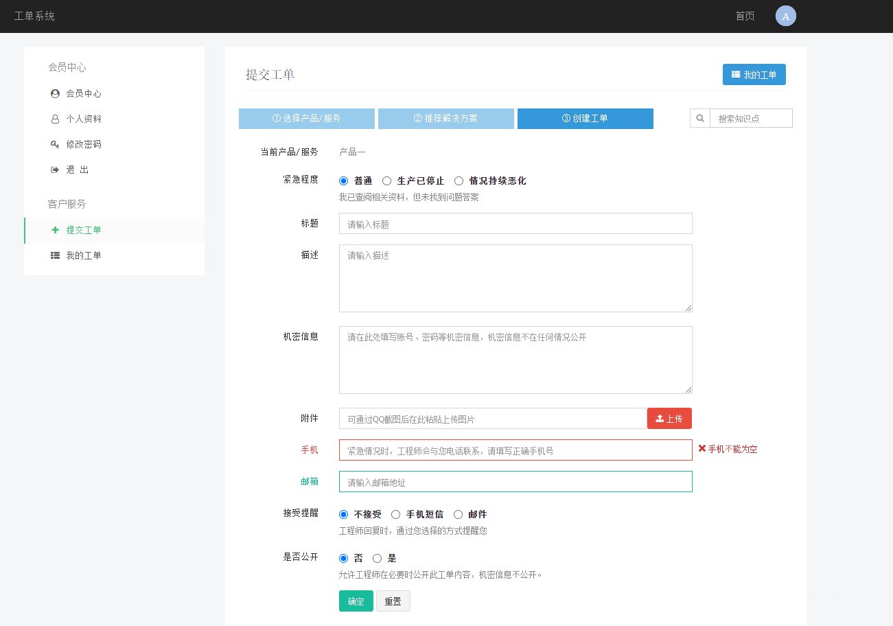 支持多工程師分配、知識庫、工單評價、自定義字段、工單通知(短信&郵件)、自定義產品或服務等功能