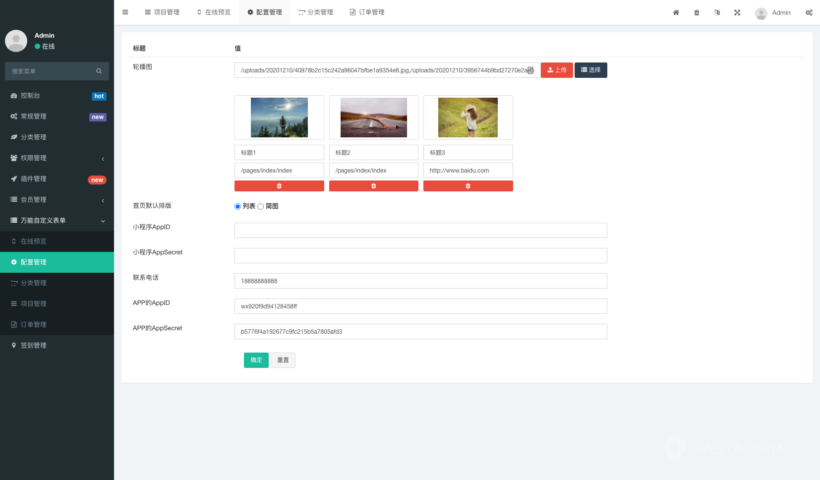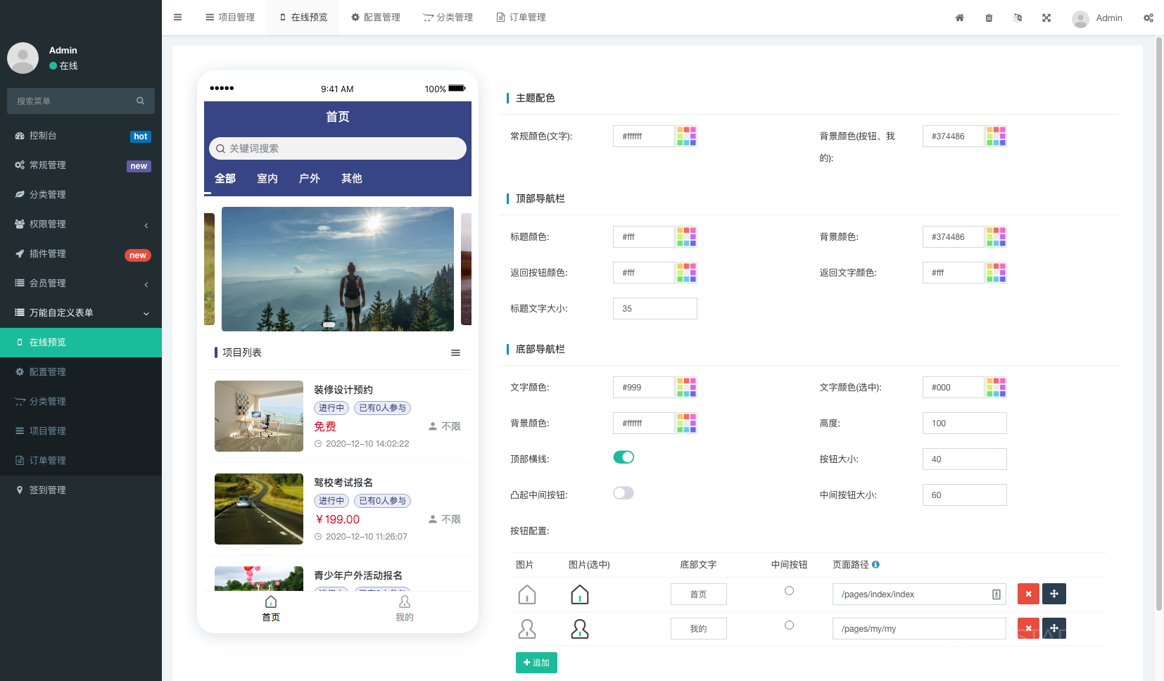 支持后臺配置移動端顏色、背景、文字等樣式,支持自定義導航欄,支持后臺實時預覽