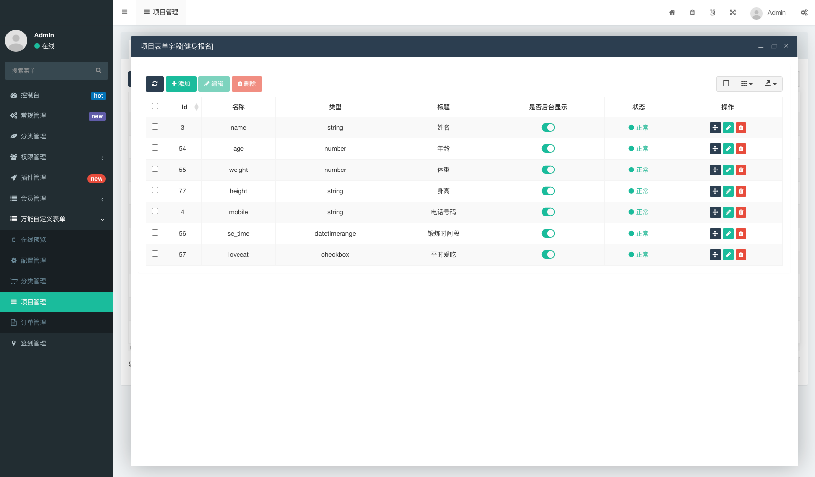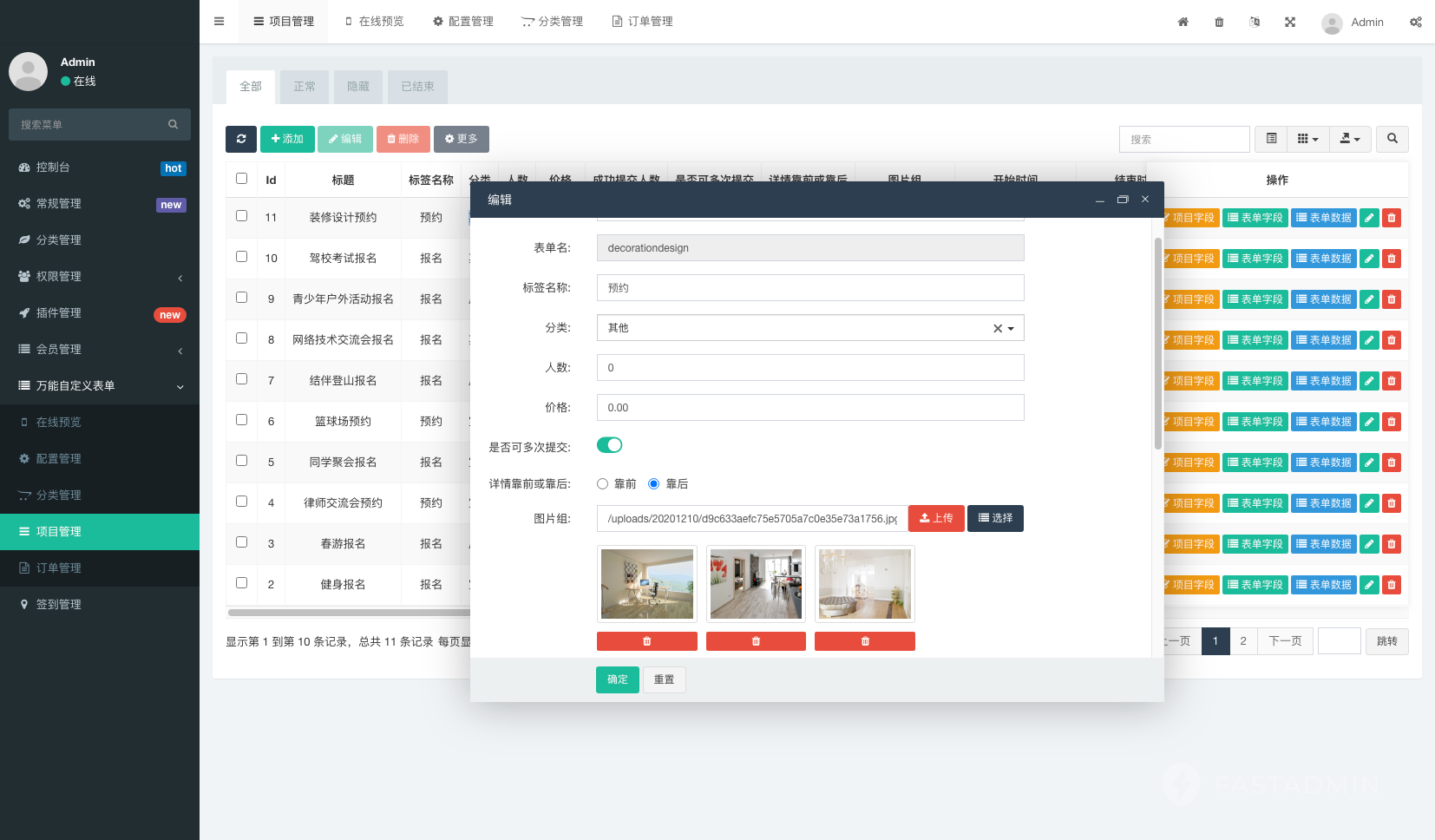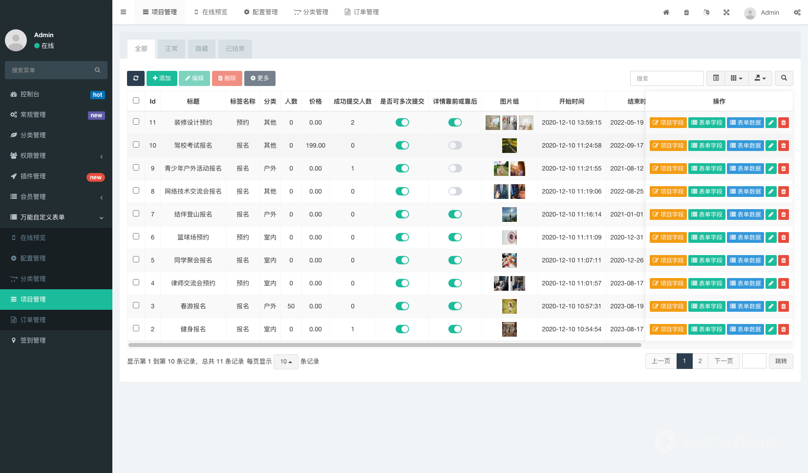 后臺功能操作簡單,支持多創建多個活動、報名、表單項目,每個項目擁有自定義配置